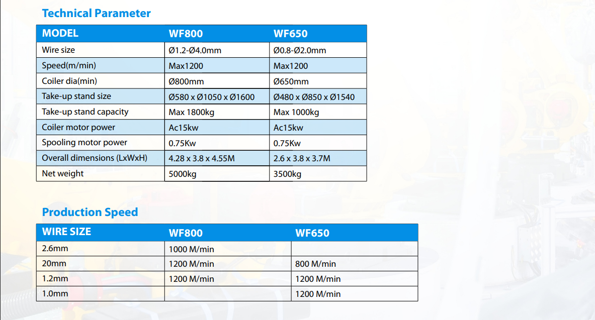• Automatic non-stop production, automatic changing of take-up wire drum.